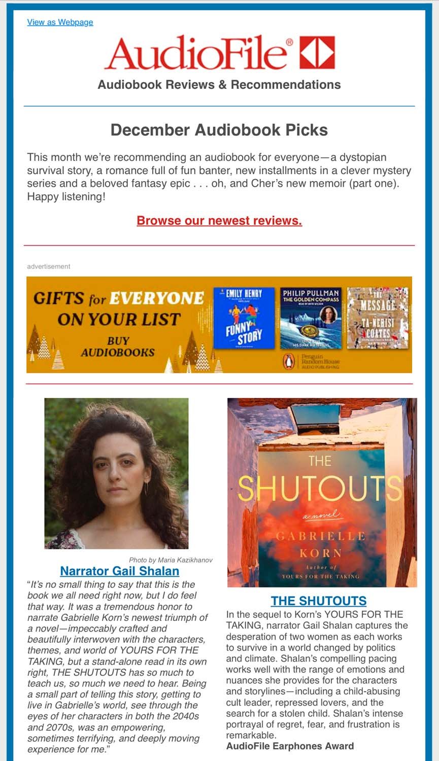 Gail was recently honored with the prestigious AudioFile Earphones Award for her narration of Gabrielle Korn’s The Shutouts.